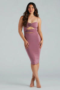 Step out looking sweet and charming in this sleeveless knit dress for a dressy soiree! It features a sweetheart neckline, spaghetti straps, a rosette flower bust inset and waist with sultry cutouts, a flattering bodycon silhouette, and a fitted midi-length hem. Complete the look with fringe earrings.