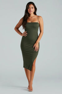 For casual plans and outings, make your look cute in this sleeveless midi dress perfect for inspiring your inner fashionista! It features a square neck, spaghetti straps, a form-hugging fit, a side ruched seam that accentuates your curves, a side slit, and a midi-length hem. Complete the look with a crop jacket and heels!