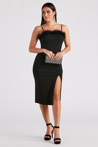 Unveil a sweet and darling allure in this showstopping crepe midi dress destined for cocktail parties or dressy dates! Featuring a sleeveless square neckline with a marabou feather trim, spaghetti straps, a form-hugging silhouette, and a sultry front hem slit. Complete the look in this mid-length dress with a statement choker necklace.