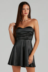 Show up ready to swoon every heart in this satin skater dress at parties! It features a strapless sweetheart neckline with non-slip grip lining, a pleated bust overlay, an eye-catching strappy lace-up back, and a short-length hem. Complete the look with a rhinestone choker and earrings!