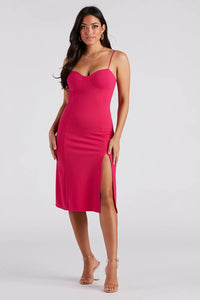 You'll be best dressed all over town in this crepe midi dress perfect for wearing on rotation! It features a sleeveless sweetheart neck with a padded bust, sleek spaghetti straps, a curve-hugging silhouette, and a flirty front slit along the flowy hem. Complete the look with a pop of gold jewelry.