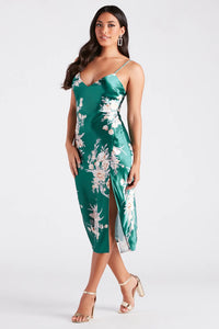 Gorgeous and chic will be your vibe in this floral silky satin midi dress. It features a sleeveless cowl neckline, adjustable spaghetti straps, a slim-fit bodice that leads to a midi-length flowy slip silhouette, a high front slit, and an all-over blooming floral print pattern. Style this mid-length dress with rhinestone earrings and an envelope clutch for a stunning wedding guest look.