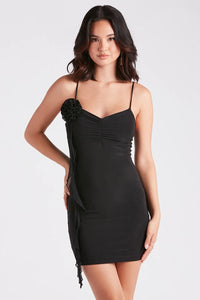 This chic rosette ruffle mini dress will be your new trendy obsession! It features a sleeveless V-neckline with ruching at the bust, spaghetti straps, a rosette accent below the shoulder with a long cascading ruffled trim, a mini-length hem, and a bodycon silhouette. The smooth knit fabric offers plenty of stretch. Perfect for date night, style this mini-length dress with lace-up heels!