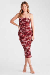 Fresh In Floral Ruched Mesh Midi Dress