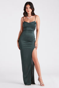 Add a touch of sexy to your evening out in this sleeveless maxi dress! It features a sweetheart neckline with cowl draping, spaghetti straps, a slim curve-hugging silhouette, a high side slit, and a long-length hem on smooth knit fabric. Complete the look in statement heels.