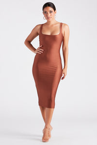 - Slim-fit bodice, midi-length slip silhouette