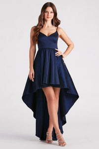 Steph Formal Taffeta High-Low Dress Steph Formal Taffeta High-Low DressSpecial Occasion Can't you picture having all eyes on you wearing the flirty Steph formal dress? Perfect for prom, banquet dinners, and dressy celebrations! She features a sleeveless V-neck, padded bust, adjustable spaghetti straps, an empire waist with hidden side pockets for keeping your hands warm, and a flattering A-line silhouette with a high-low hem. The formal dress is composed of a taffeta woven fabric with multiple tulle and stretchy knit linings. Complete the look in strappy block heels. Fit & Features - Sleeveless V-neck, padded bust