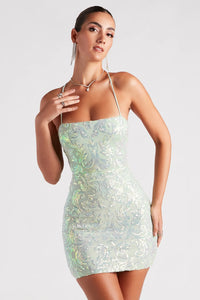 Sultry Radiance Sequin Bodycon Mini Dress Sultry Radiance Sequin Bodycon Mini DressEntice them all with sultry radiance in this stunning sequin mini dress! It features a sleeveless plunging V-neckline with a wired notched design, a padded bust, spaghetti straps that lead to an open back with a lace-up design for a customized fit, and a mini-length hem with a form-fitting bodycon silhouette. The lined mesh fabric features all-over sequin embroidery in an eye-catching scroll pattern. Complete your look in this mini-length dress with clear heels. Fit & Features - Sleeveless plunging V-neckline, wired notched design