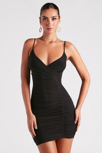 Make Your Move V-Neck Mini Dress Make Your Move V-Neck Mini DressMake your move out on the dance floor in this sassy mini dress sure to get all the attention! The sleeveless dress features a surplice V-neckline, spaghetti straps, and side and front ruched seams that define your curves along the bodycon fit. Complete the look with a rhinestone bracelet and heels. Fit & Features - Sleeveless surplice V-neckline