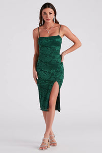 Date Night Approved Floral Lace Midi Dress Date Night Approved Floral Lace Midi DressThis alluring floral lace midi dress is totally date night approved! It features a sleeveless square neckline, spaghetti straps, an open back with a strappy lace-up design for a customized fit, a midi-length hem with a high front slit, and a form-hugging silhouette. The sheer lace fabric includes a full knit lining. Style with sleek stilettos. Fit & Features - Sleeveless square neckline