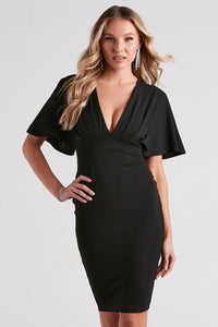 Flutter On Crepe V-Neck Midi Dress Flutter On Crepe V-Neck Midi DressLet this crepe midi dress flutter into your semi-formal lineup! The dress features breezy short sleeves, a plunge V-neckline, bust pleating, and a form-hugging silhouette. Style with sleek pumps for a business lunch or networking event! Fit & Features - Flutter short sleeves
