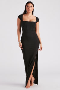 Esme Slim-Fit Corset Formal Dress Esme Slim-Fit Corset Formal DressSpecial Occasion Classic and chic with a hint of sultriness, the Esme formal dress will catch all the glances! She features a square neckline, a fitted corset-designed bodice with flexible boning to provide structure, short cap sleeves, a high waist seam, an asymmetric floor-length hem creating a thigh-high side slit, and a slim-fit silhouette. The crepe fabric offers a moderate stretch. Complete the look with rhinestone statement earrings. Fit & Features - Square neckline, fitted corset bodice, flexible boning inserts