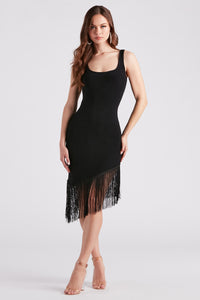 Roaring 20s Sleeveless Fringe Midi Dress Roaring 20s Sleeveless Fringe Midi DressEnter into the roaring 20s-inspired style wearing this sleeveless midi dress for your next cocktail party! Featuring a scoop neck, tank straps, a bodycon silhouette, and an asymmetrical hem with a fringe hem on stretchy knit fabric. Pair with clear block heels for a seamless-chic look! Fit & Features - Sleeveless scoop neck