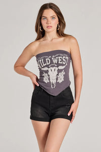 The graphic tee features a trendy longhorn and floral graphic and a script reading, "Wild West, Wild Spirit." The open tie-back design adds some allure, while the asymmetric cropped hem brings a casual-cool vibe.