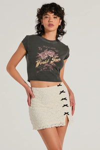 Rock and roll on your world tour in this cute graphic tee! It boasts cap sleeves, a crew neckline, a rose graphic front design with a script that reads "Wild At Heart Rock & Roll", and a modern raw cut cropped hem. Complete the look in jean shorts for casual plans!