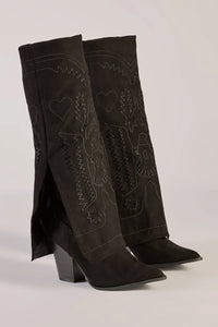 Add western flair to your look with these folded under-the-knee boots with trendy embroidery on smooth faux suede material. Pair with a cowboy hat.