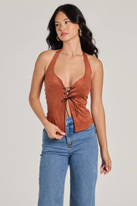 Country Girlie Halter Lace-Up Faux Suede Crop Top