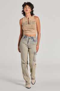 This pair of denim jeans features a flattering high-rise waist, a straight-leg design, a side zipper pocket for stylish function, and a relaxed hem. The jeans are crafted from a tinted denim fabric with minimal stretch for style and comfort.