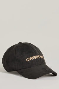 A faux suede cowboy script hat that says it all! Style this hat with a basic romper for grabbing coffee.