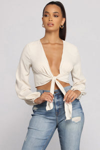 Trend alert! Impress in a tie front top that comes in a super cute print for that next happy hour with the squad! The top features a plunging v-neckline with a tie front accent, long sleeves, and a trendy geometric print. Complete your look with high waist skinny jeans.