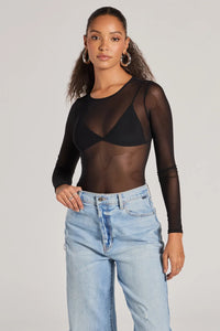 Accentuate your curves with this long-sleeve bodysuit, ideal for layering over a bralette. This chic mesh bodysuit strikes the perfect balance between modern edge and classic style. Pair this sheer top with high-rise denim jeans for a look that suits a variety of occasions, from casual outings to dressed-up events. An eye-catching essential, it layers beautifully under a fitted blazer or sleek moto jacket, making it the perfect versatile top.