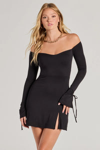 An off-the-shoulder mini dress that'll give you many chic moments! The crepe dress is designed with long fitted bell sleeves with flirty tie accents and a front slit for movement. Complete the look with a necklace.