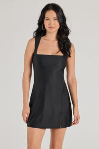 Style up this slinky knit mini dress featuring a sleeveless square neckline with tank shoulder straps and a short-length hem with a flirty A-line silhouette. Complete your look for a girl's night with stiletto heels.