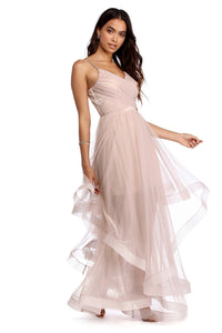 Special OccasionMake their hearts flutter as you make a dreamy entrance in our ethereal McKenna dress! She features a sleeveless bodice, narrow satin straps, a V neckline, padded cups and a wrapped bodice with a lightly pleated accent. Her bodice leads to a voluminous multi-tiered tulle skirt with a wide banded hemline and a mini skirt length knit lining. She offers a relaxed fit with a minimal stretch. Includes a back zipper closure with a fish hook clasp.