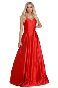 Special OccasionStun as a lady in red in our charming Aubree dress! She features a sleeveless bodice, a wired V neckline with flattering princess seams, padded cups and wide shoulder straps. Her bodice leads to a lightly pleated voluminous multi-layered skirt with trendy side pockets and a wide banded hemline. Her multi-layered skirt is composed of a satin fabric and a dramatic petticoat. She offers a form hugging fit with minimal stretch. Includes back zipper closure.