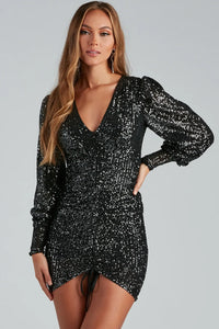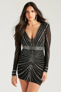 Catch all the glances as you illuminate the night with the gorgeous radiance of the Rayna formal mini dress. She features a deep V-neckline, shoulder pad inserts for extra drama, sheer long fitted sleeves, a mini-length hem, and a bodycon silhouette to hug your curves. The stunning iridescent rhinestone embellishments cascade down the length of the dress in a figure-flattering pattern and form a high waist design. The sheer mesh fabric includes a sleeveless short lining. Style with metallic heels to sparkle at prom!