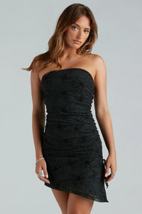 Heat things up in this strapless asymmetric mini dress to inspire your next wine night or birthday outfit! The short dress is designed with a strapless neckline, form-hugging fit, adjustable side drawstring atop a flirty side slit, an asymmetric mini-length hem, and a velvet burnout butterfly pattern on lined mesh fabric. Style the mini dress with gemstone heels for a touch of glamour!