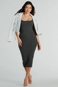 This bodycon midi dress is the perfect blend of effortless and chic! Designed with a stretchy ribbed knit fabric for that comfortable fit, this mid-length dress features a trendy sleeveless square neck and back design with thin tank shoulder straps. The ribbed design on the body-hugging silhouette will flaunt your gorgeous figure. Layer on a faux leather jacket and pair with ankle booties for a night out!