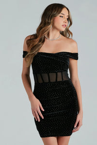 An off-the-shoulder neckline brings sultry charm to the glamorous Adriena velvet party! She features short-sleeve cuffs, a sparkly rhinestone-embellished bust, a sheer mesh bodice with flexible boning, a flattering bodycon silhouette, and a mini-length hem with rhinestone-embellishments. The party dress is composed of a soft velvet fabric with glitzy rhinestones all over and has a sewn-in knit lining. Complete the look for a formal birthday or celebration with dangly earrings and heels.