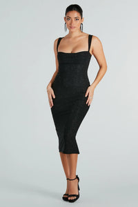 Sparkle the night away in this glitter midi dress at parties or nights out! Designed with a cowl neckline that highlights your bust, spaghetti straps, and a strappy back, this dress offers a form-hugging fit that flatters your figure. The shimmering glitter fabric adds a touch of glamour, while the front slit and midi-length hem give you a stunning silhouette. Complete the look in block heels.