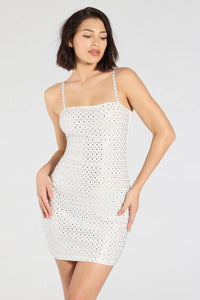 Enter your glam babe era in the Farah strappy back mini dress designed with a curve-hugging bodycon silhouette. The lined mesh fabric is embellished with countless rhinestones for a glitzy effect.