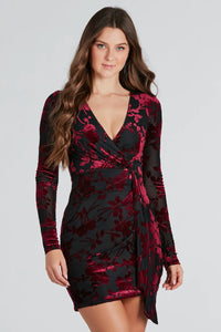 An irresistible evening look will be had in this party mini dress! Designed with fitted long sleeves, a flattering surplice V-neckline, and a tie-front detail to cinch your waist. The bodycon silhouette and mini-length hem are finished with a luxurious velvet burnout pattern. Complete the look with teardrop stud earrings for a holiday dinner party!