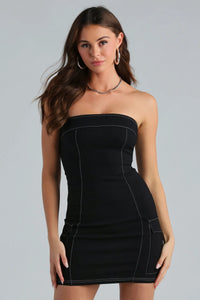 A chic night in Miami or LA calls for this spicy strapless mini dress! The strapless neckline and bodycon fit and side ruched seams will enhance your curves, while the cutout back with hoop insert adds an extra show of skin. Complete the look in platform heels and earrings.
