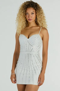 Elevate your night in this sparkly rhinestone mini dress! Featuring a sweetheart neckline and adjustable spaghetti straps, a padded bust, this mini-length dress hugs your body in a flattering bodycon silhouette. The rhinestone embellished pattern adds a touch of sparkle, making it perfect for bachelorettes, birthdays, and clubs! Complete the look in rhinestone strappy heels.