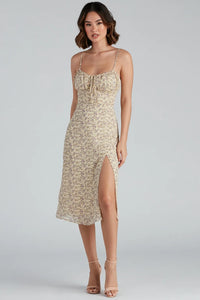 Ready for a floral retreat? Feel the sunshine on your shoulders in this floral chiffon midi dress featuring dainty spaghetti straps, a sweetheart neckline with a bust tie, a fitted bodice, and a side slit accent. Complete the look in simple heels.