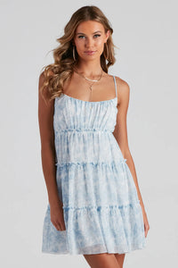 Sashay and sway in this adorable floral chiffon dress featuring a sleeveless, scoop neck, adjustable spaghetti straps, smocked back panel, and a flowy, ruffled tiered short hem. Complete the look in trendy sandals for your next getaway.