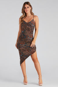 Look like a babe in this paisley midi dress to bring those retro vibes! It features a sleeveless V-neck, adjustable spaghetti straps, a bodycon silhouette, and an asymmetrical midi-hem with a trendy ruched seam. Complete the look in block heels for happy hour.