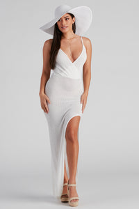 Strut down the pier looking so fab in this maxi coverup dress featuring a sleeveless V-neckline, tank straps, and a form-fitting silhouette with a sultry front slit. The coverup dress is composed of an unlined semi-sheer knit fabric that offers a form-hugging fit. Perf for layering over your bikinis, complete the look in sandals.