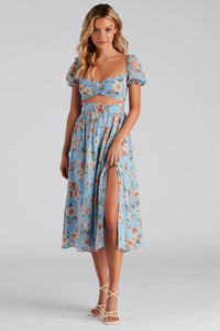This floral cutout midi dress makes getting ready a breeze! It features short puff sleeves and a ruched sweetheart bodice with a flirty waist cutout that leads to a flowy, midi-length silhouette with a slit accent. Composed of a chiffon-lined fabric with no stretch. Style with a trendy mini tote.