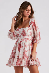 Look cute for Sunday brunch in this floral chiffon skater dress featuring three-quarter length puff sleeves, a square neck, and a pleated waistband on the skater silhouette. Showcase a peek of skin in the open-back design with tie closure and ruffled short-length hem. Composed of a chiffon floral lined fabric with no stretch. Perfect for styling with knee-high boots.