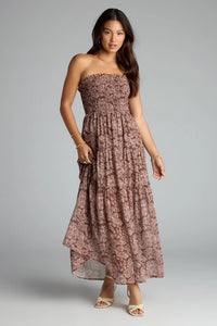 Easy, breezy, and made for photoshoots and parties. This strapless chiffon maxi dress with a smocked bodice and floral print gives off-carefree weekend energy with a soft, boho vibe.