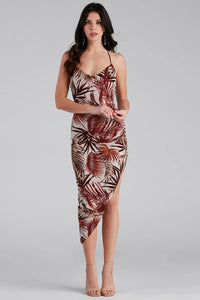 Vacation on the mind? You're going to need this tropical midi dress with paradise written all over it! Features a sleeveless, v-neck, adjustable spaghetti straps, a form-fitting silhouette, and a side ruched seam on an asymmetrical midi hem. Complete the look in lace-up sandals for a dinner with a view.