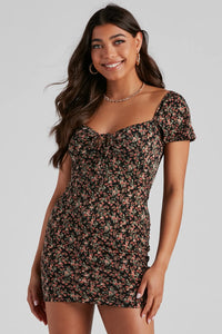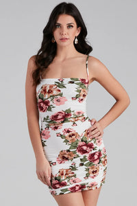 Hey beauty! Showcase your charm in this blooming floral bodycon dress. It features a sleeveless square neckline, spaghetti straps, chic ruching down the sides, and a short, curve-hugging silhouette. Style this dress with sparkly stud earrings and cute mules.