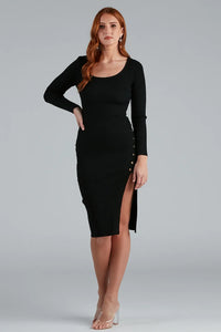 Go from office hours to happy hour in a snap with this classy sweater midi dress! It features long sleeves, a rounded neckline, a bodycon silhouette, and a side slit with snap button accents. Composed of a ribbed knit fabric with a moderate stretch. Style with a chic jacket and heels.