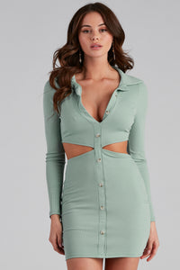With this mini dress, you'll be ready for whatever plans come up! It features long sleeves, a collared neck, button-down closures, a sultry cutout bodice on a bodycon silhouette. Composed of stretchy rib-knit fabric. Style with mules.