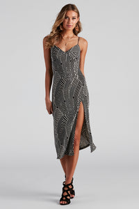 Answer the call in a fierce midi dress! Showcase your unique style in this geometric crepe midi dress featuring a sleeveless, V-neck, sleek spaghetti straps, and a slim-fit silhouette with a front slit accent. Complete the look in lattice booties.
